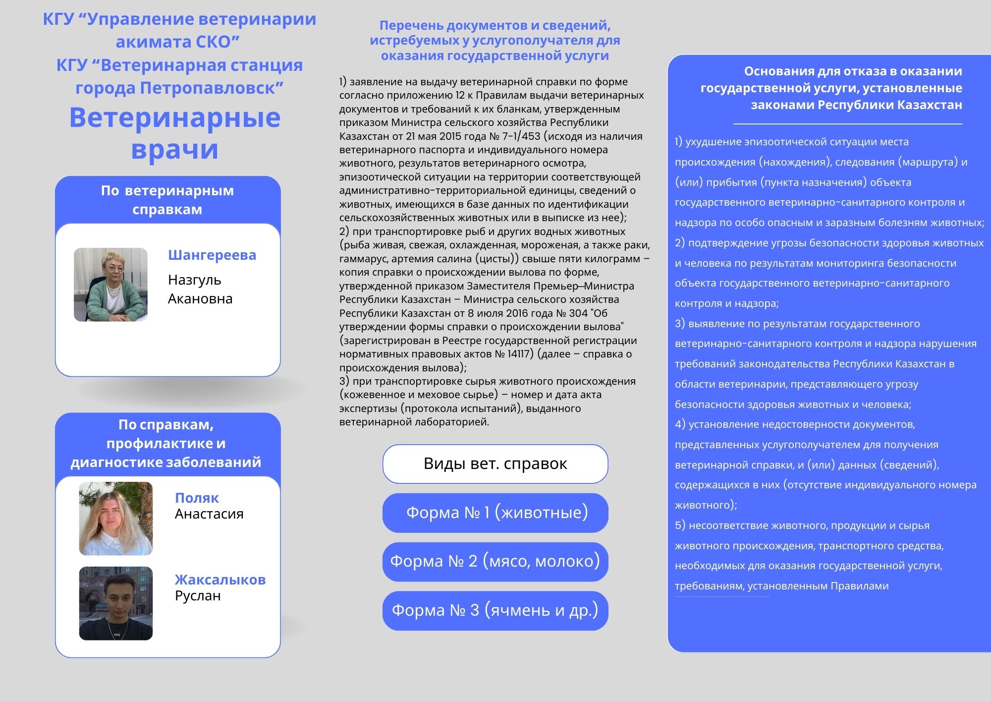 В КГУ «Ветеринарная станция города Петропавловск» КГУ «Управление ветеринарии акимата Северо-Казахстанской области» разработаны брошюры для населения: «Выдача ветеринарной справки». На постоянной основе специалистами ветеринарной станции города Петропавловск, проводятся информационно-разъяснительные мероприятия по получению государственных услуг.