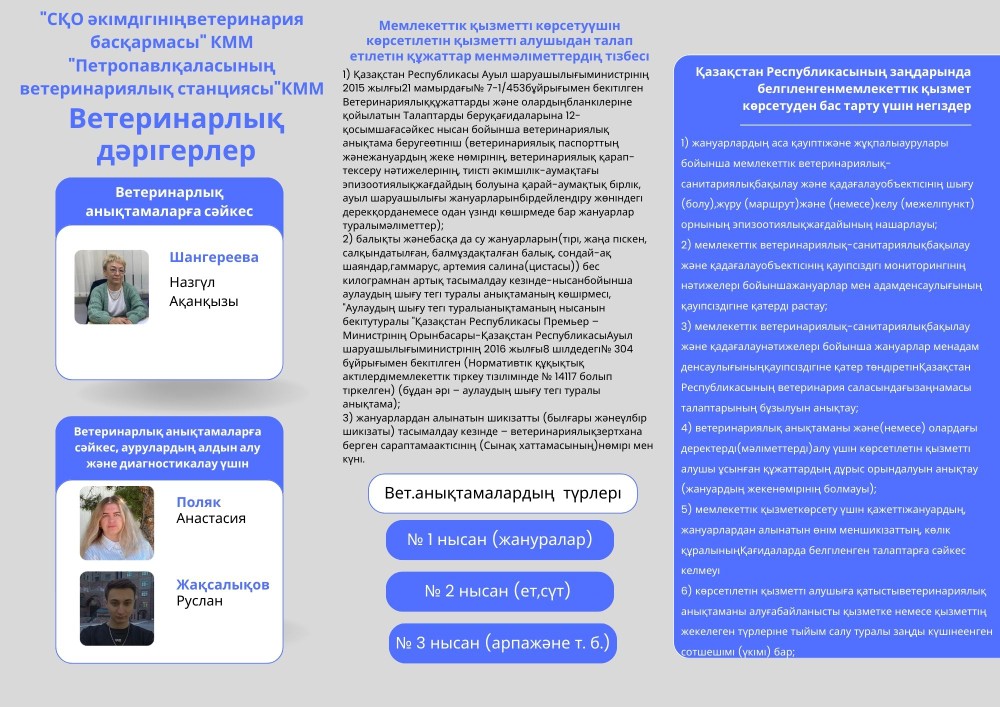 «Петропавл қаласының ветеринариялық станциясы» КММ «Солтүстік Қазақстан облысы әкімдігінің ветеринария басқармасы «КММ аудан тұрғындары үшін»ветеринариялық анықтама беру» брошюралары әзірленді. Петропавл қаласының ветеринариялық станциясының мамандары тұрақты негізде мемлекеттік қызметтерді алу бойынша ақпараттық-түсіндіру іс-шараларын жүргізеді.